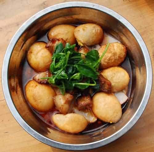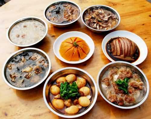 “八大碗”都是用笼子蒸出来的,清淡味香,营养丰富,口感极好。冒着热气的“八大碗”刚端上桌,一股清香扑鼻而来,那颜色、香味直叫人垂涎欲滴,忍不住就想拿起筷子抢先品尝。就说那木耳蒸土鸡吧,主料是农家用粮食喂养出来的乌脚鸡,辅料是黑黑的小木耳,经厨师放入化油、鸡精、食盐、生姜等佐料,清蒸2个小时出笼,还要在飘着油的汤面撒上些许葱花。舀一勺汤喝喝,满口生香;夹一块肉尝尝,鲜美无比,巴适惨了。还有那鲜黄诱人的八宝蛋,先将农家的土鸡蛋放入水中煮熟去壳后放入油锅中炸成金黄色,再将五花肉切成拇指大小的颗粒,放入锅中加豆瓣、花椒、鸡精等炒熟后,把准备好的芋头、土豆或红苕放到小瓷盆中垫底,再将土鸡蛋铺在小瓷盆四周,把炒好的五花肉倒在鸡蛋中间,加适量的食盐、鸡精等佐料,蒸好后的八宝蛋吃起来香嫩可口,与传统的荷包蛋大不一样,软软的香味充盈你的口腔,剌激着你的味觉,岂不美哉?那看起来十分肥腻的烧白可是一道好菜,因有农家的干咸菜吸收了大量的油水,吃起来肥而不腻,“肥肉咽烧酒”,爱喝酒的朋友往往在觥畴交错中夹一块放在嘴里,喝酒的热情更为高涨。剩下的干咸菜也不浪费,吃饭时夹一点送入口中,香浓沁脾,口齿留香……